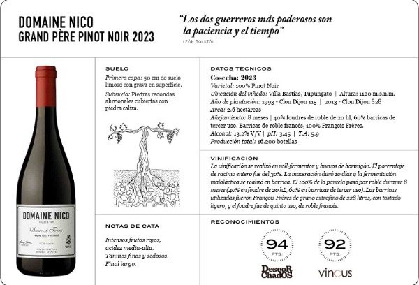 ”Grand Père es una de las parcelas que siempre nos llamó la atención desde que comenzamos la selección de plantas y trabajar con distintos porcentajes de racimo enteros. La elaboración en cada añada es distinta, pero tenemos lineamientos que seguimos año a año". - Roy Urvieta, winemaker Domaine Nico.